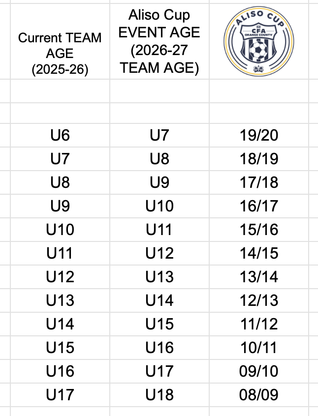 *a few games may be played on Friday night (May 29) in order to minimize schedule conflicts - if you are interested playing Friday night, please reach out. Any coach bringing three teams should be prepared to play on Friday night (all friday night games will be coordinated directly with the coach).Aliso Cup is U16 to U6, due to the timeline for forming U17 and U18 teams, we will not be offering brackets in those ages.